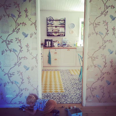 Tilslutt måtte jeg henge opp en liten tapetprøve på lekerommet- drømmer nemlig om tapet på en eller to vegger der inne også. Har man tapetdilla- så har man det;)Og denne tror jeg hadde vært helt nydelig der inne.